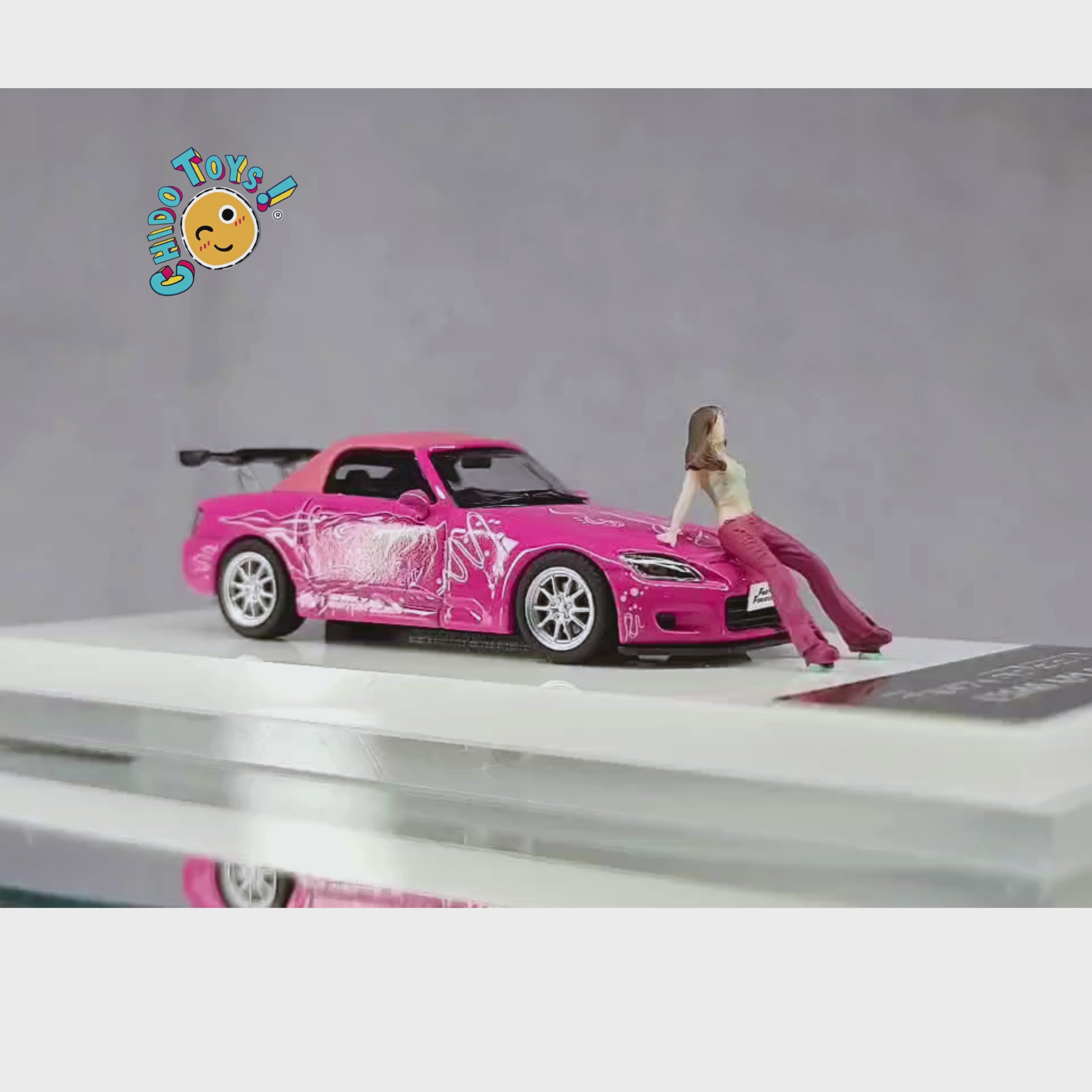 Este modelo a escala 1:64 del Honda S2000 de la marca Fast & Speed destaca por su vibrante carrocería rosa con gráficos blancos de estilo anime, logrando una presencia visual inconfundible. Fabricado en cuerpo de metal con llantas de goma funcionales, ofrece gran realismo y calidad para los coleccionistas más exigentes.