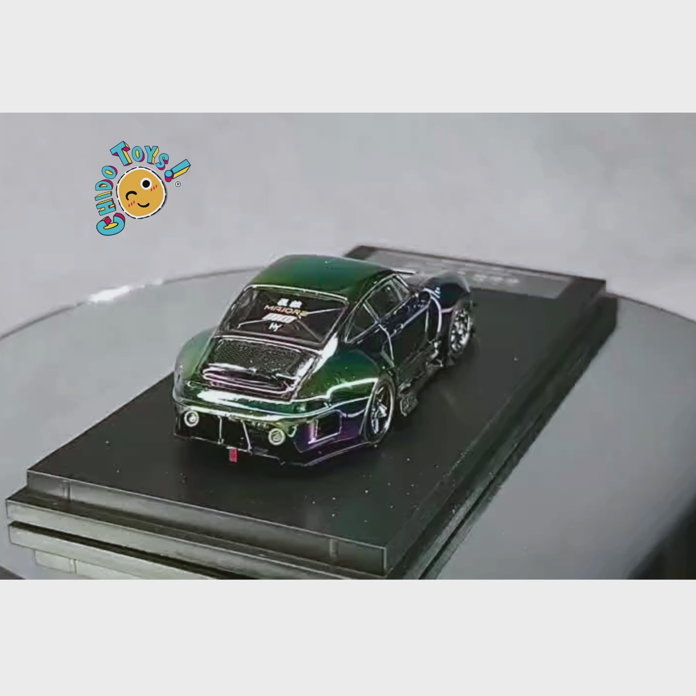 Auto a escala 1/64 de la marca DCM, modelo Porsche 993 RWB Chrome Ductail, una pieza que roba miradas gracias a su espectacular acabado camaleón cromado.