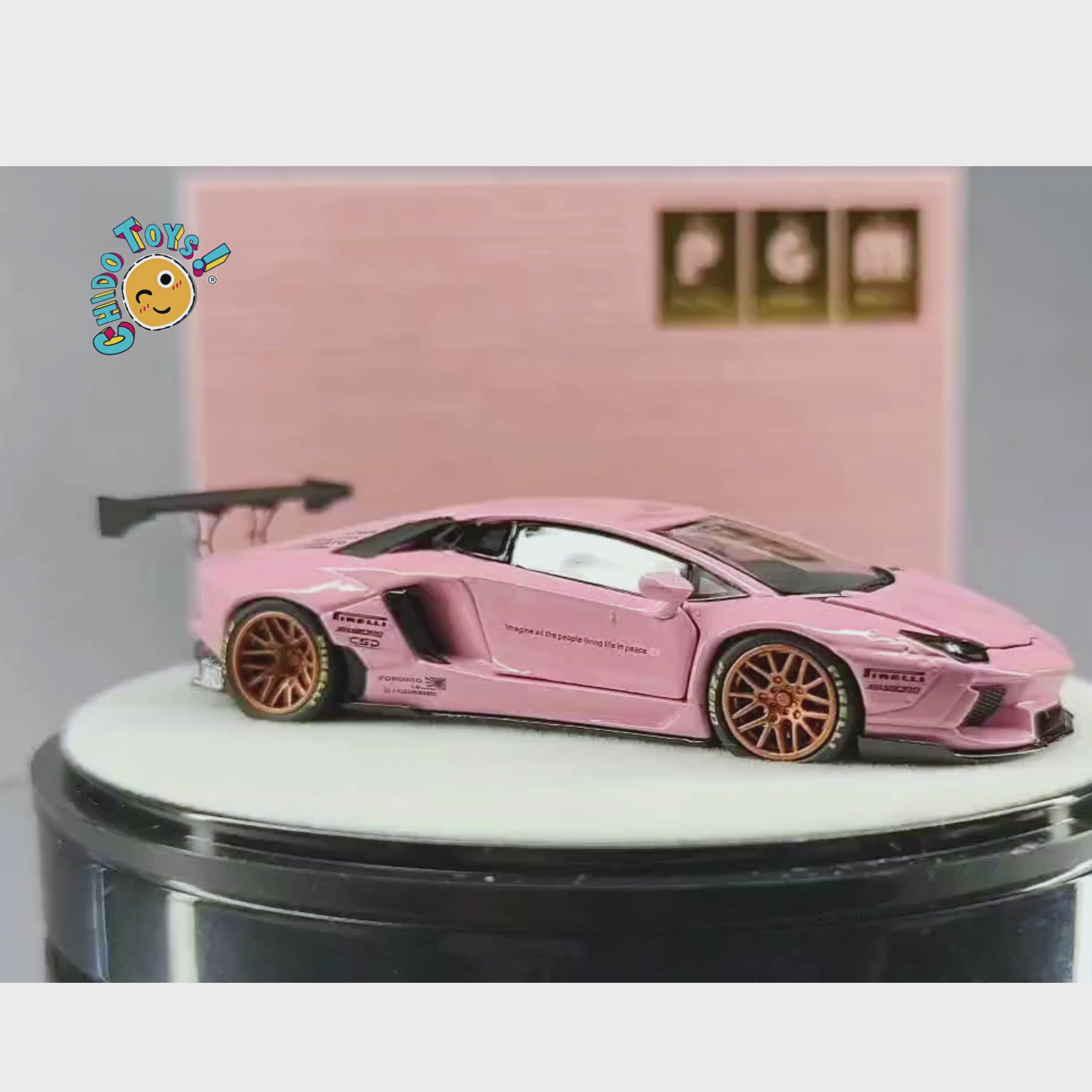 Modelo exclusivo de la marca PGM, este Lamborghini LP700-4 con kit Liberty Walk (LBWK) en color rosa combina lujo y agresividad con una ejecución impecable. Fabricado en metal, cuenta con llantas de goma y un nivel de detalle excepcional tanto en interiores como en el motor.