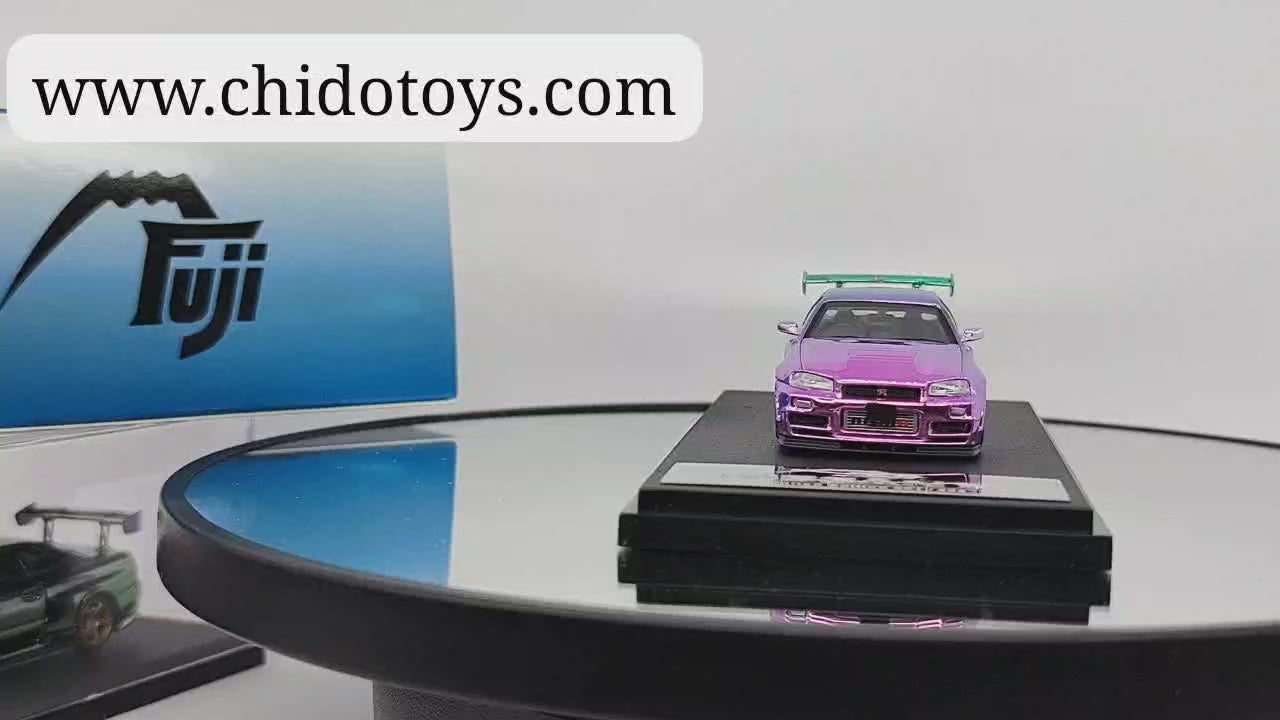 Dale un toque de distinción a tu colección con este Skyline GT-R R34 Nismo Z-Tune High Wing de la marca Fuji. Su acabado en pintura espejo con efecto camaleón y su escala 1:64 resaltan cada curva y detalle.