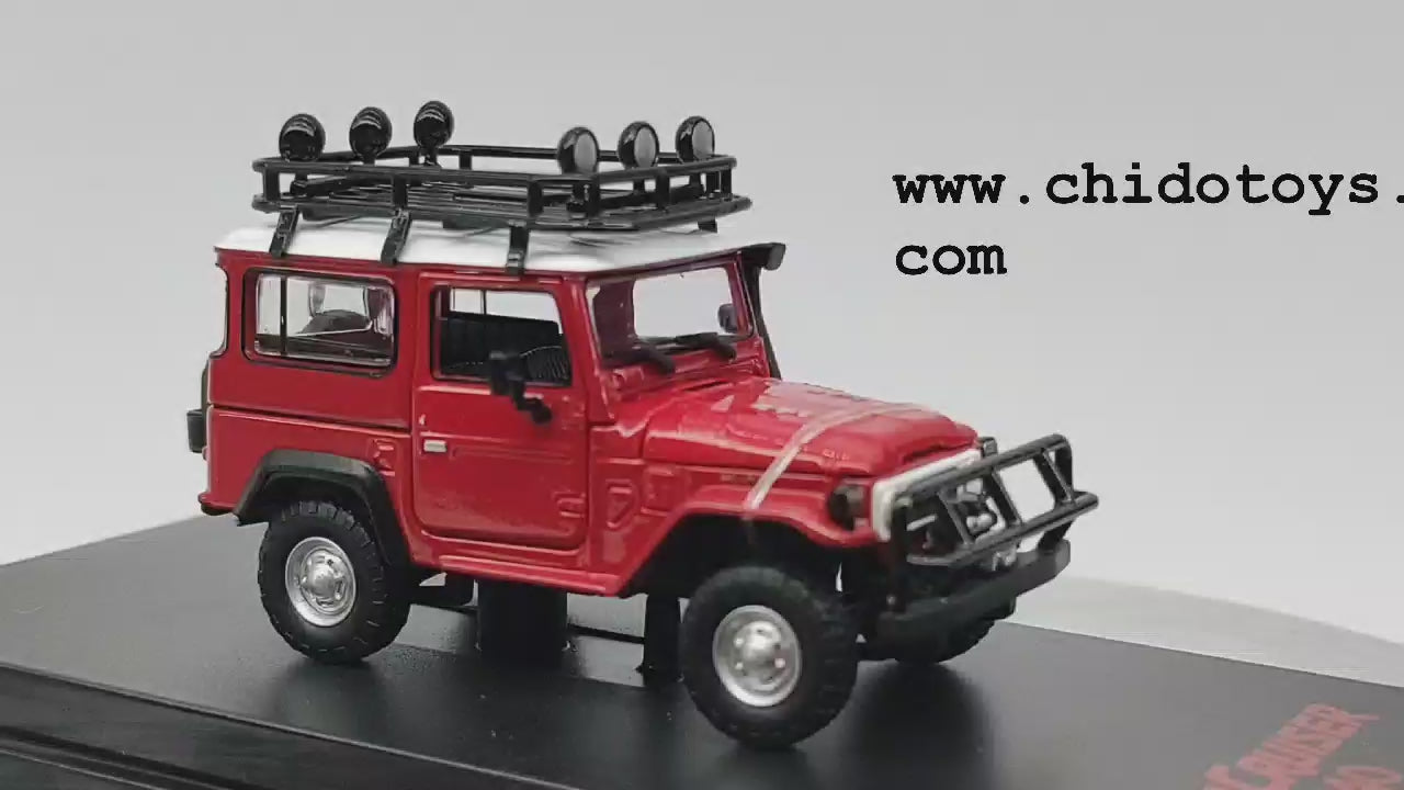 Escala 1:64, cuerpo de metal, llantas de goma (si giran), apertura de cofre, motor detallado contiene canastilla que se sujeta mediante al toldo, capelo de acrílico y base.