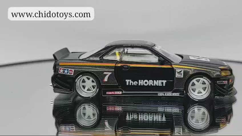 Escala 1:64, base y cuerpo de metal, llantas de goma (si giran) aros de rines en aluminio, apertura de cofre con motor detallado, volante de lado derecho; detalles que simulan fibra de carbono en cofre, cajuela, salpicaderas, difusor trasero y lip delantero.