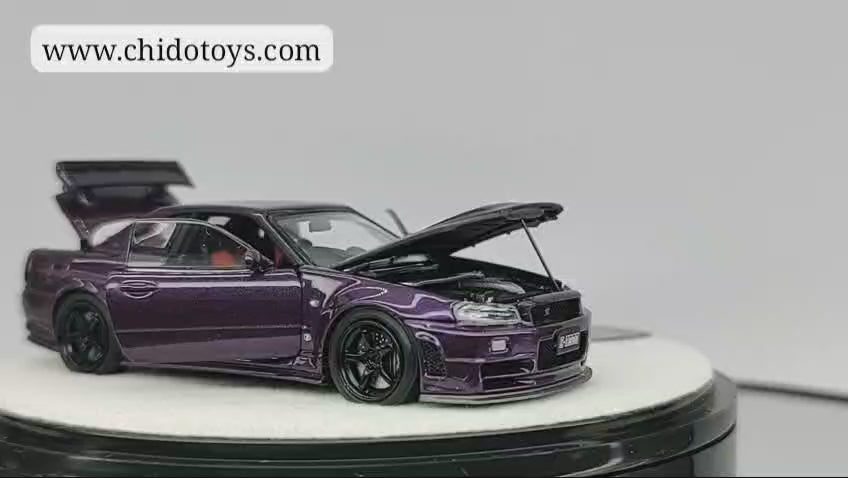 Escala 1:64, cuerpo Die-Cast, llantas de goma, apertura total; puertas, maletero y cofre, edición de lujo que incluye una réplica del legendario motor Rb26, base giratoria y capelo de acrílico.