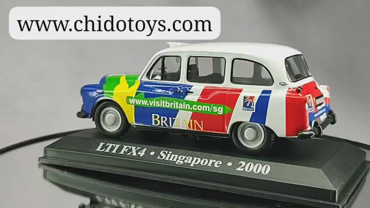 Dale un toque colorido y distintivo a tu colección con este Taxi LTI FX4 Singapore 2000 a escala 1:43. Un modelo fiel al icónico taxi británico adaptado para la campaña "Visit Britain" en Singapur, con un espectacular diseño multicolor.
