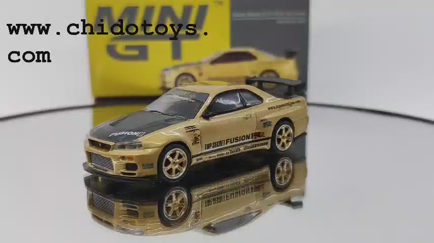 Añade a tu colección una pieza legendaria con este Skyline GT-R R34 TOP SECRET Gold, fabricado por Mini GT en escala 1:64. Inspirado en la icónica preparación de Smokey Nagata, este modelo captura el espíritu de la alta performance japonesa con un acabado impresionante.